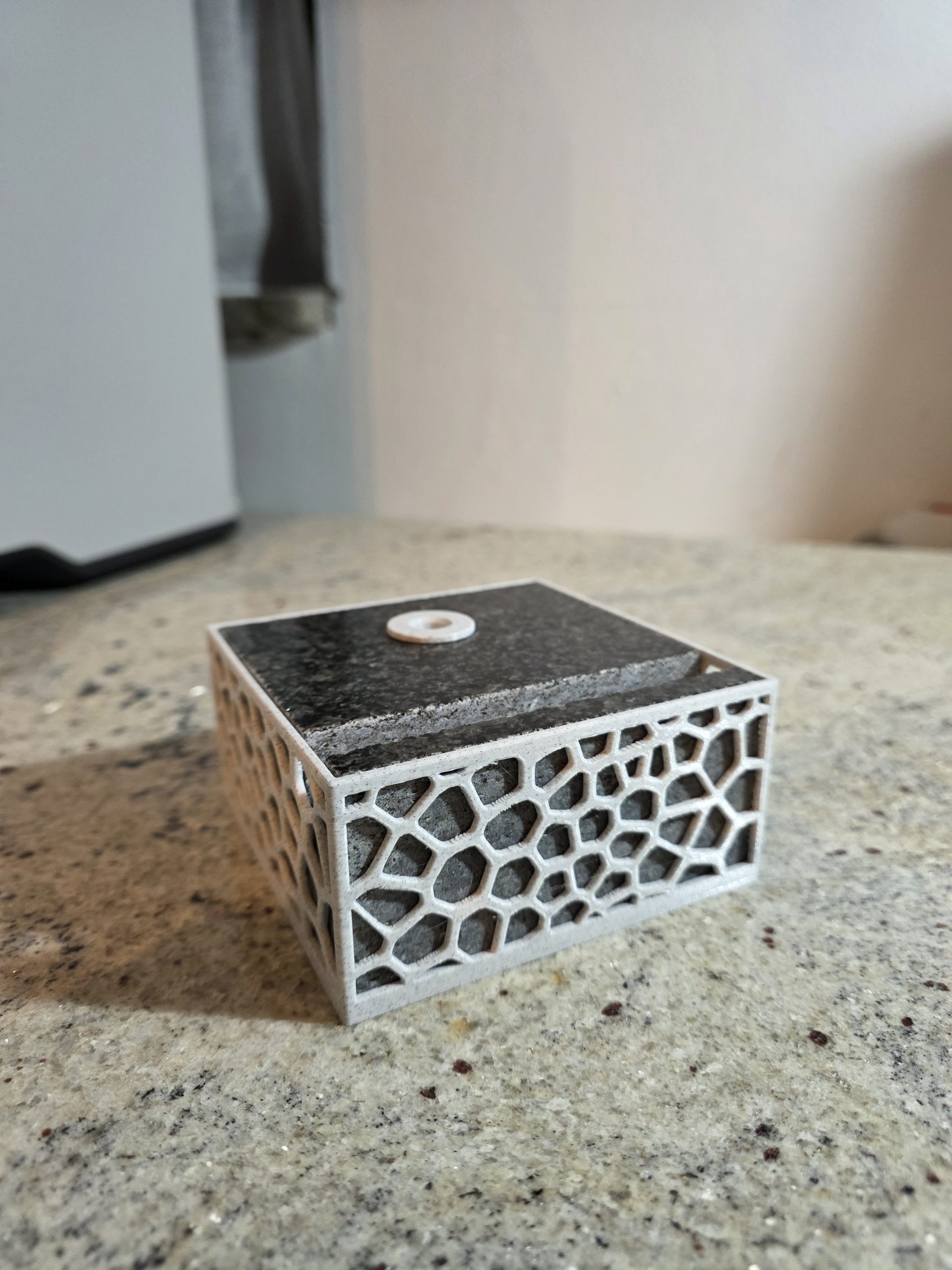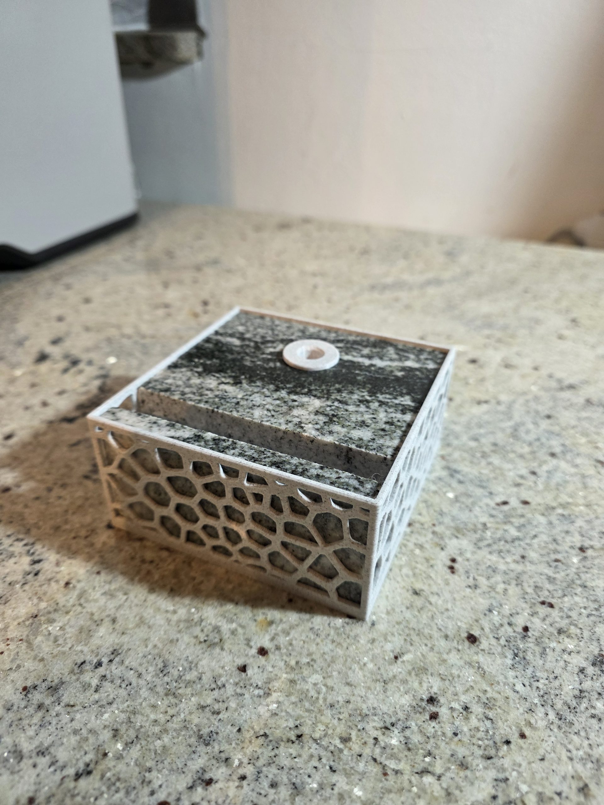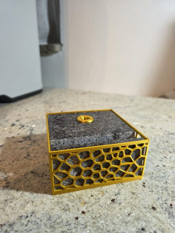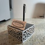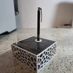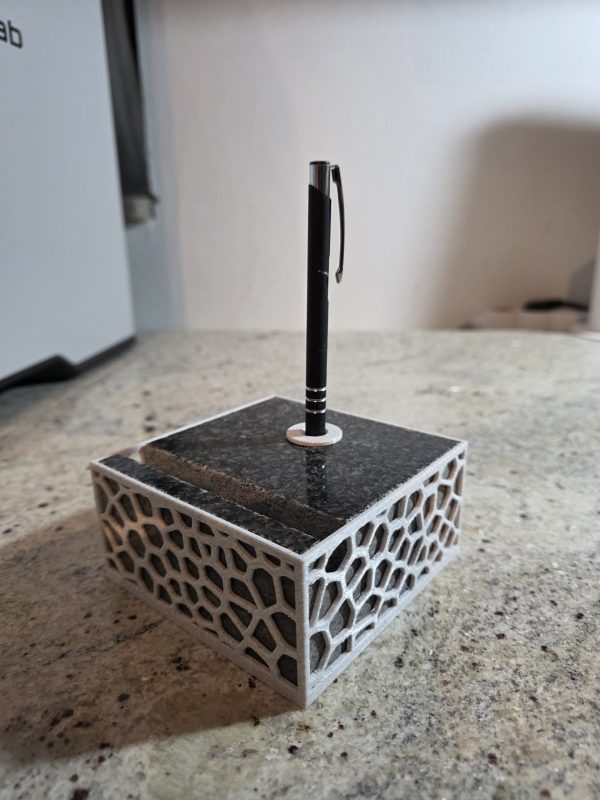 Ovaj stolni držač kombinira težinu i stabilnost prirodnog granita s precizno izrađenim 3D printanim uloškom. Granitna baza osigurava čvrstoću i dugotrajnost, dok 3D print omogućuje funkcionalan i uredan raspored jedne kemijske olovke i vizitki.