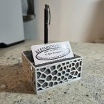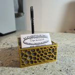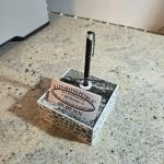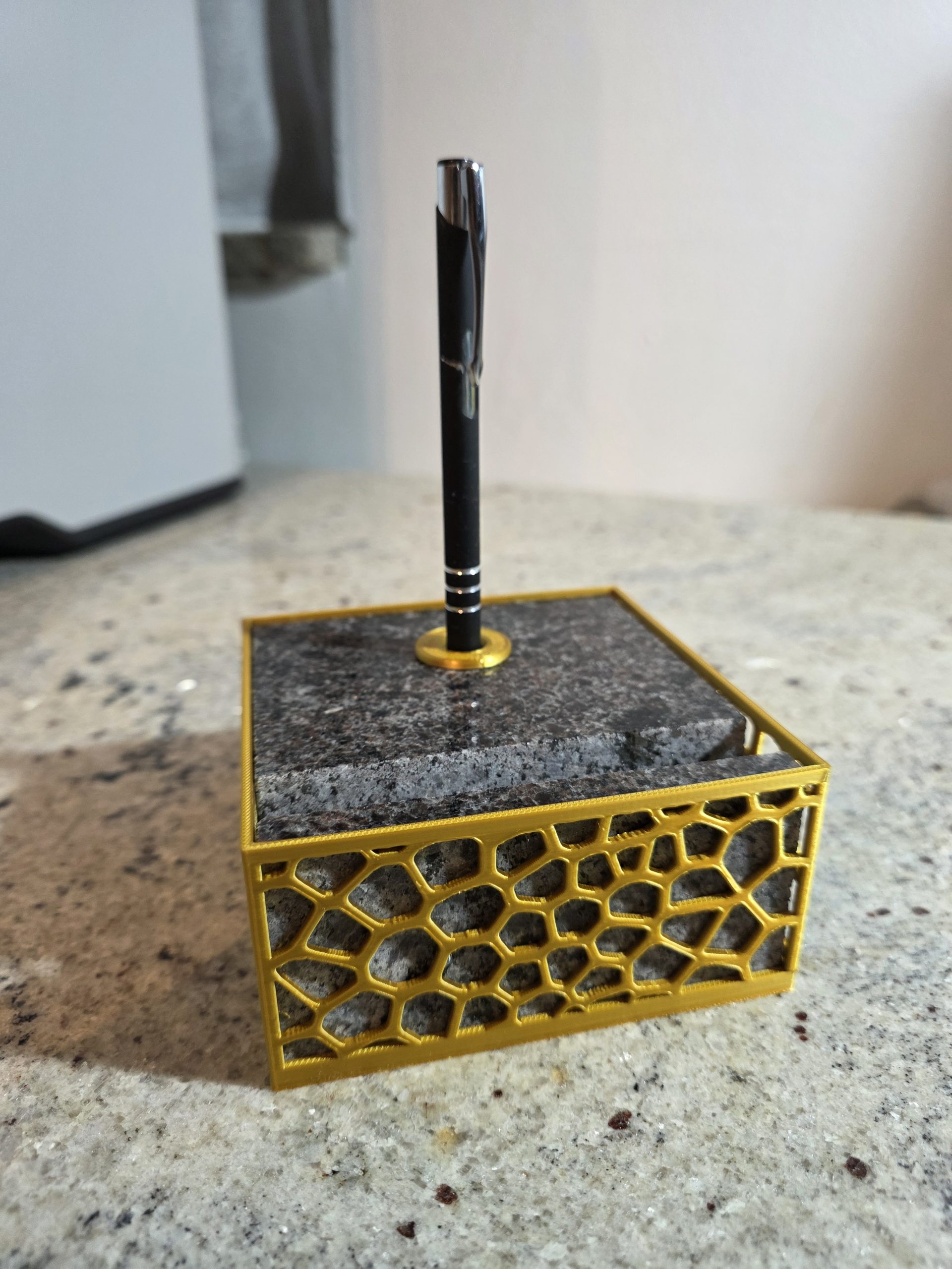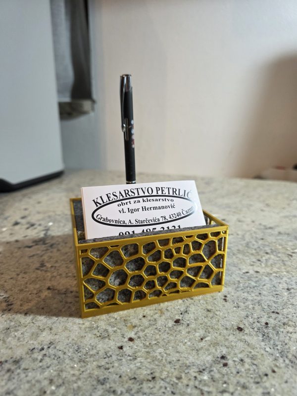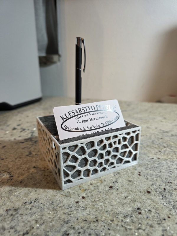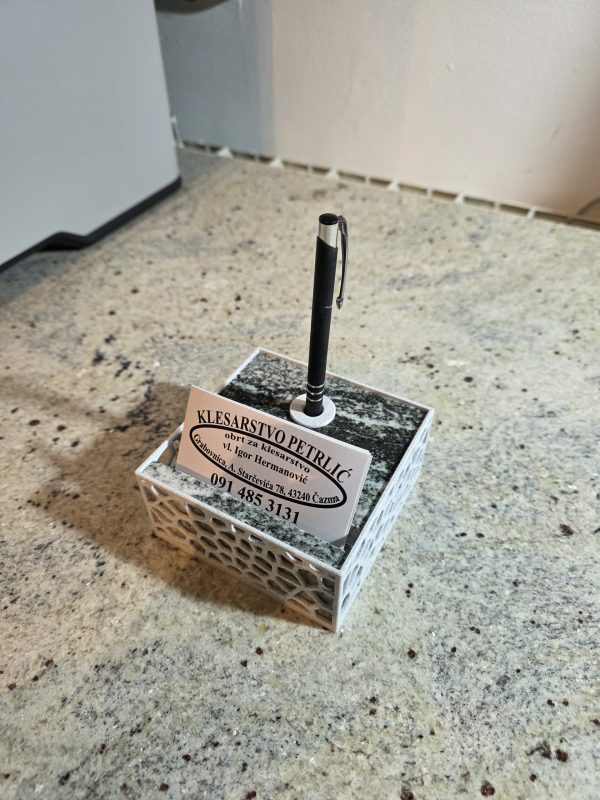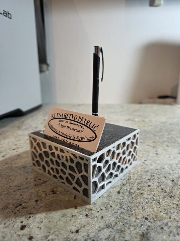 Stolni držač s bazom od prirodnog granita i funkcionalnim 3D printanim uloškom. Stabilno i praktično rješenje za organizaciju kemijske olovke i vizitki na radnom stolu.