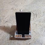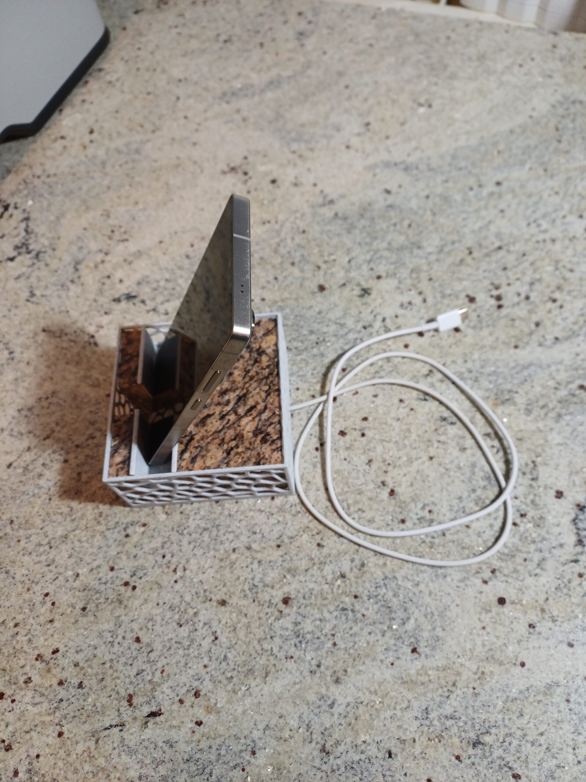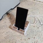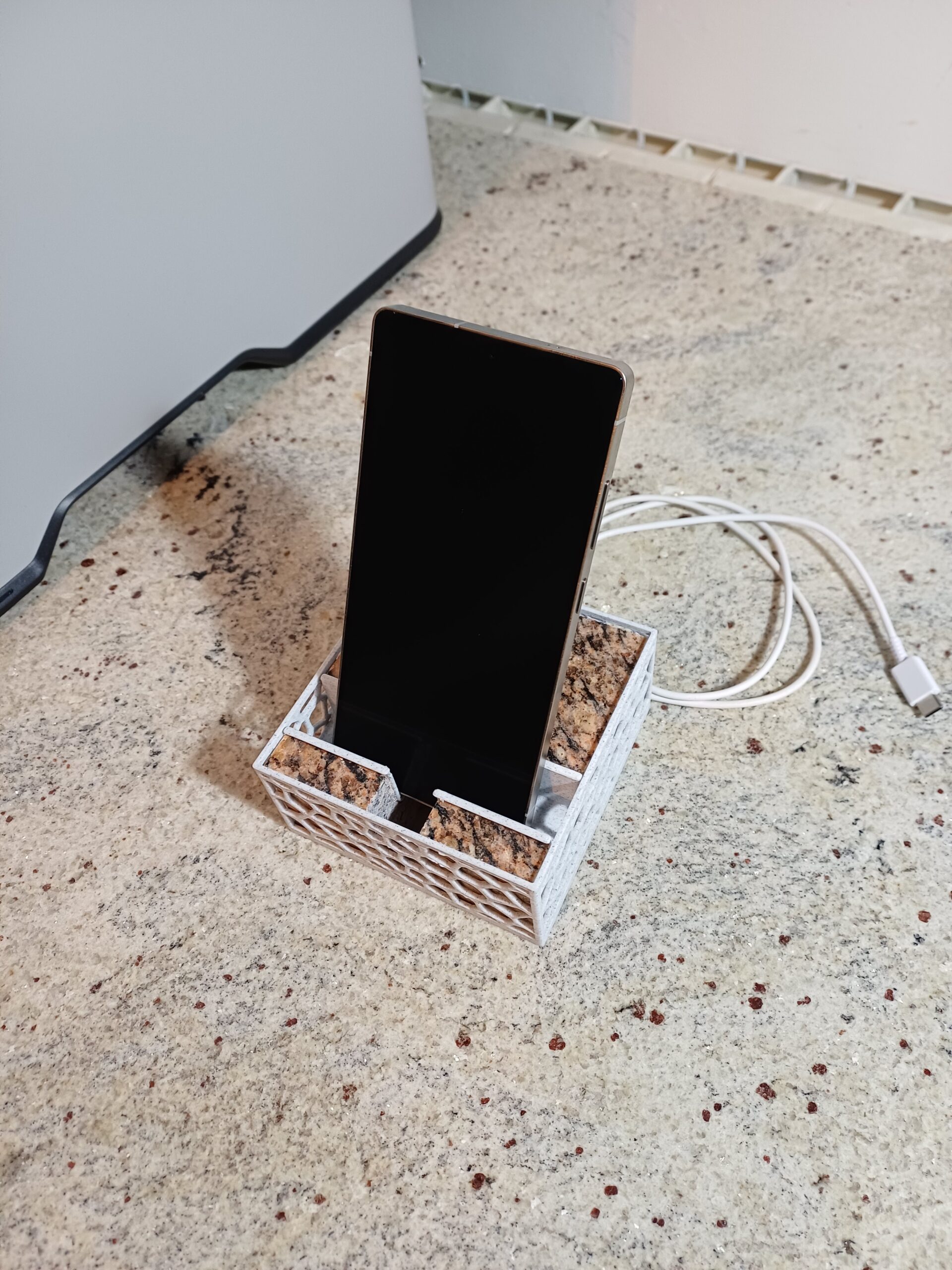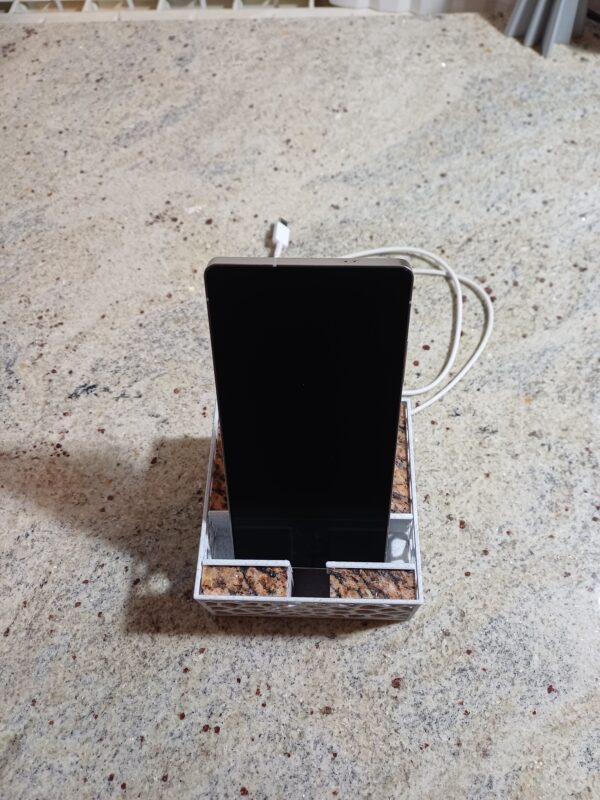 Stolni držač s bazom od prirodnog granita sa urezom za kabel. 3D printana košarica radi zaptite stola i samog mobitela.